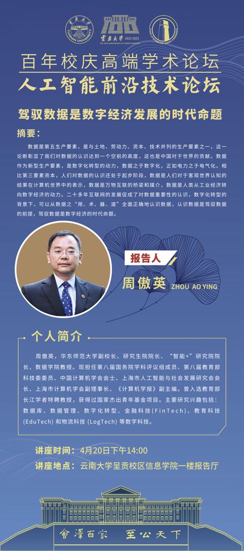 个人简介:周傲英,华东师范大学副校长、研究生院院长、“智能+”研究院院长、数据学院教授。现担任第八届国务院学科评议组成员、第八届教育部科技委委员、中国计算机学会会士、上海市人工智能与社会发展研究会会长、上海市计算机学会副理事长、《计算机学报》副主编。曾入选教育部长江学者特聘教授,获得过国家杰出青年基金项目。主要研究兴趣包括:数据库、数据管理、数字化转型、金融科技(FinTech)、教育科技(EduTech) 和物流科技 (LogTech) 等数字科技。