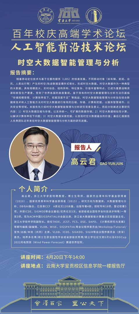 简介:高云君,浙江大学求是特聘教授,博士生导师,国家杰出青年科学基金获得者(2020) 、国家优秀青年科学基金获得者 (2015) 。研究方向为数据库、大数据管理与分析、DB与AI融合,已发表CCF A类论文120余篇,出版专著4部,授权专利18项,登记软著3项,并获ICDE、SIGMOD等会议最佳/优秀论文5次,省部级或全国性学会科技进步特等/一等奖3项。现为ACM中国SIGSPATIAL分会副主席,浙江省大数据智能计算重点实验室副主任,浙江大学软件学院副院长。担任TKDE、JCST、FCS、DSE、DAPD、《计算机研究与发展》等期刊编委/副编辑,VLDB、WISE、SIGSPATIAL等会议程序委员会/Workshop/Tutorial/宣传/出版/本地 (共同) 主席,VLDB、ICDE、SIGKDD、SIGIR等会议程序委员会(资深)委员。培养多名博/硕士生获全国性学会或省部级优秀博/硕士学位论文奖6次以及KDDCup2022风电预测 (Wind Power Forecast) 赛道世界冠军。